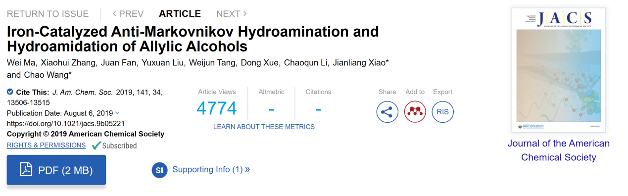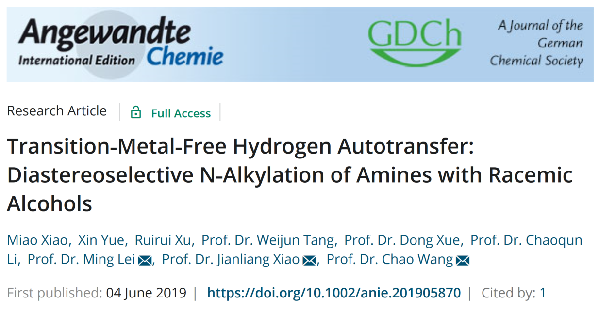 发展绿色、高选择性的催化反应是解决化学带来的环境污染,实现社会可持续发展的重要手段之一。基于催化脱氢过程的氢转移反应是一类绿色的化学反应类型。“绿色催化与合成团队”的王超课题组一直致力于发展新的催化剂、催化体系和策略来控制氢转移反应中的选择性问题,以期发展绿色、高效、高选择性的有机化学转化方法。先后发展了用于氢转移反应的环金属铱催化剂(Chem. Eur. J. 2015, 21, 9656; ACS Catal. 2017, 7, 1831)、双铑催化剂(Chem. Sci. 2016, 7, 4428; Green. Chem. 2016, 18, 4605; Chem. Eur. J. 2017, 23, 14445; ACS Catal. 2019, 9, 4441)、双铜催化剂(Chem. Eur. J. 2017, 23, 3051; Chem. Eur. J. 2017, 23, 3062; Catal. Sci. Technol. 2017, 7, 5510)以及铁催化剂(Chem. Eur. J. 2018, 24, 13118),实现了系列基于氢转移过程的高化学选择性反应。近期,课题组进一步拓展了铁催化选择性氢转移过程的应用(J. Am. Chem. Soc. 2019, 141, 13506),并在不对称氢转移领域取得进展(Angew. Chem. Int. Ed. 2019, 58, 10528)。