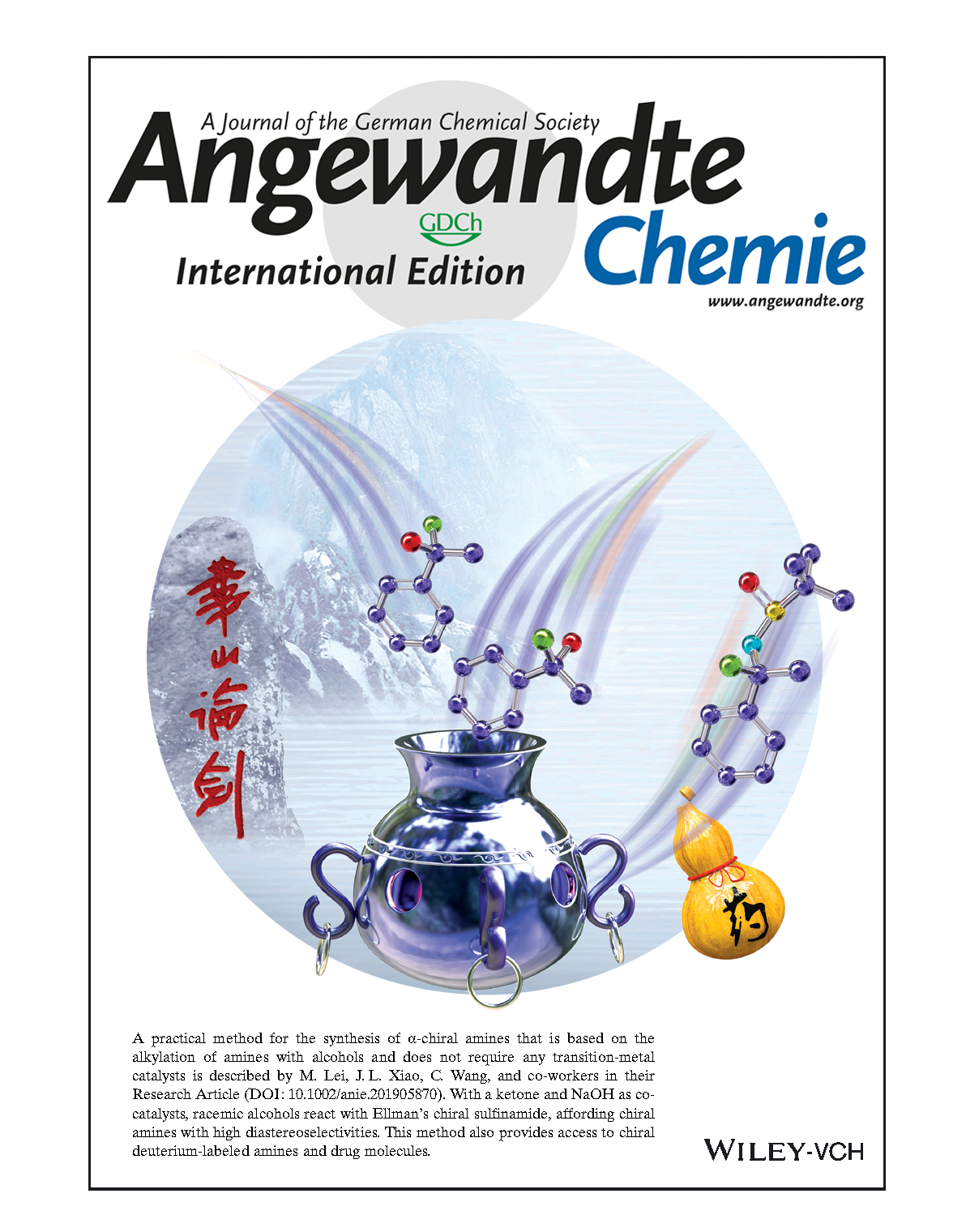 基于氢转移策略,课题组发展了一例无过渡金属催化合成手性胺的方法,并通过和北京化工大学的雷鸣教授合作对反应机理进行了阐述。研究发现,在催化量的NaOH和酮存在下,消旋仲醇能和手性叔丁基亚磺酰胺反应得到高非对映选择性的手性胺类物质。该反应可以用来制备各种α-手性芳胺类化合物。反应原料和催化剂易得,可以放大到10 g级规模制备,反应产物可通过简单的酸解得到手性伯胺。特别重要的是,当使用氘代消旋仲醇时,能以高的氘代率和非对映选择性得到相应的氘代手性胺,并可应用于氘代手性药物的合成,如NPS R-568和(S)-Rivastigmine。该反应为手性胺的制备提供了一种简便的方法;由于没有过渡金属参与、操作简便,该方法具有在工业,特别是制药工业上制备手性胺的应用前景。