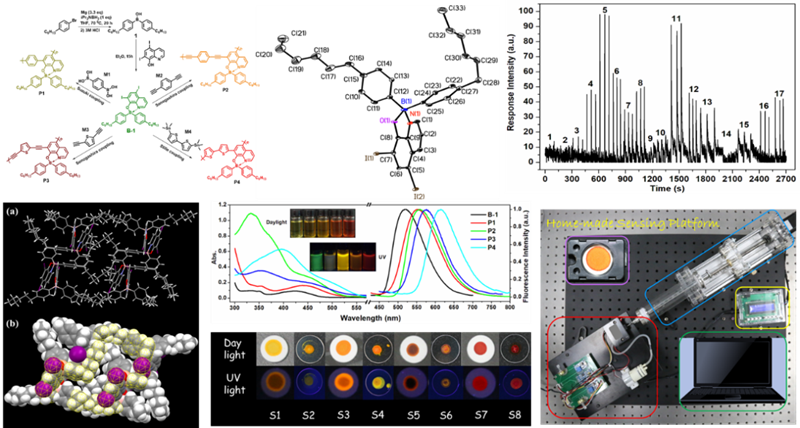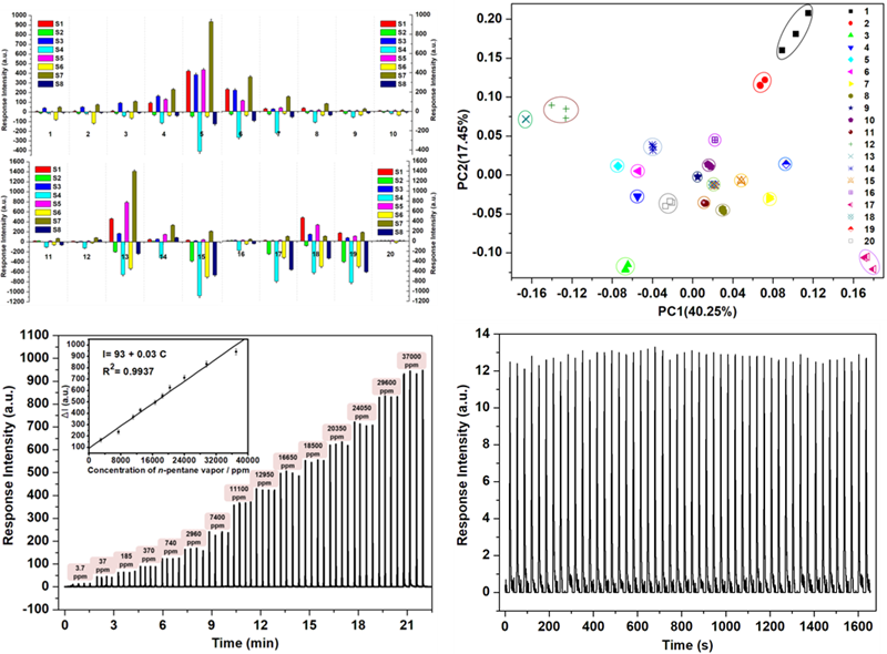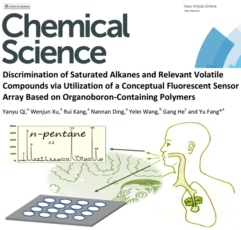 饱和烷烃是一类重要的信号物质,在消化系统、呼气系统某些疾病,特别是肺癌的早期诊断,油气资源的普查勘探中具有重要的意义。然而,饱和烷烃化学性质稳定,也缺乏光电活性,这就使得其原位在线高灵敏探测变得十分困难。针对这一挑战,房喻教授小组创造性将非平面荧光单元引入薄膜结构,制备了富含“分子通道”的荧光薄膜阵列,利用内聚能差异,薄膜通道的体积选择、极性选择,以及传感单元荧光量子产率的溶剂依赖性等,在自行搭建的系统上实现了对饱和烷烃的气相高灵敏选择性快速识别和检测。对肺癌标示物正戊烷的检测灵敏度可达3.7 ppm以下,系统响应速度小于1 s,且可实现稳定重复使用,有望在肺癌早期诊断中获得应用。该工作近期在化学领域顶级期刊《Chemical Science》上在线全文发表。论文第一作者为公司2016级博士研究生祁彦宇同学,合作者包括硕士研究生徐文君、康蕊,本科生丁南南,物理学与信息技术公司硕士研究生王烨蕾,以及西安交通大学的何刚教授等,通讯作者为房喻教授。
