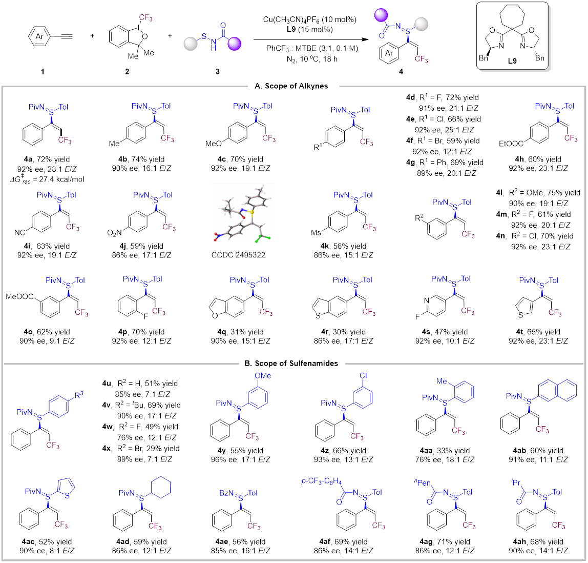 作者首先使用苯乙炔1a作为模板底物,Togni-I 2为自由基前体,次磺酰胺3a为硫源,Cu(MeCN)4PF6为催化剂对手性配体进行了大量筛选,确定得到构建单一硫手性反应的最优条件。接着作者对炔烃和次磺酰胺的底物范围进行考察,无论是芳环上带有给电子基团还是吸电子基团,或烷基的底物均能以良好的收率、优异的立体和对映选择性得到烯基硫亚胺产物(图2)。