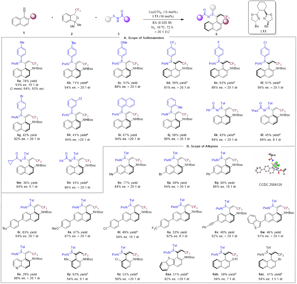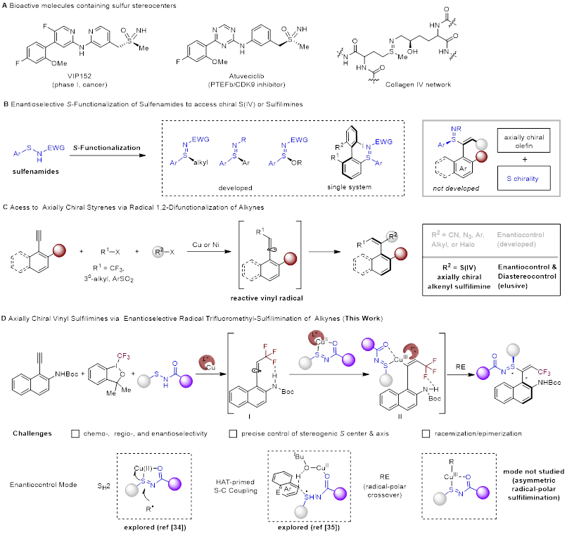 手性硫亚胺是一类重要的合成砌块,在生物活性分子构建中发挥着关键作用。然而,硫原子对过渡金属催化剂具有较强的配位与毒化效应,导致其不对称合成长期面临严峻挑战。目前,能够高效构建手性硫亚胺的不对称催化方法仍然有限,尤其是通过一步反应同时构建包含硫手性中心在内的多个立体元素,依然存在显著困难(图1b)。近日,公司李兴伟/肖纪超团队基于前期研究基础(J. Am. Chem. Soc. 2025, 147, 38931–38941),通过巧妙的底物设计与配体调控,发展了一种铜催化的自由基接力策略,成功实现了大位阻末端炔烃的三氟甲基-硫亚胺化反应,高效构建了轴手性乙烯基硫亚胺类化合物(图1d)。本工作的主要亮点包括:(1)通过巧妙的底物设计,实现铜-硫亚胺物对原位生成的高活性瞬态乙烯基自由基的对映选择性捕获;(2)精准调控了反应的化学选择性、区域选择性、非对映选择性以及对映选择性。(3)结合实验与理论计算,阐明反应经Cu(III)中间体的对映选择性还原消除过程,并揭示底物中C–H···F相互作用对高对映选择性的关键影响。相关研究成果发表于Angew. Chem. Int. Ed. 2026, e23530。